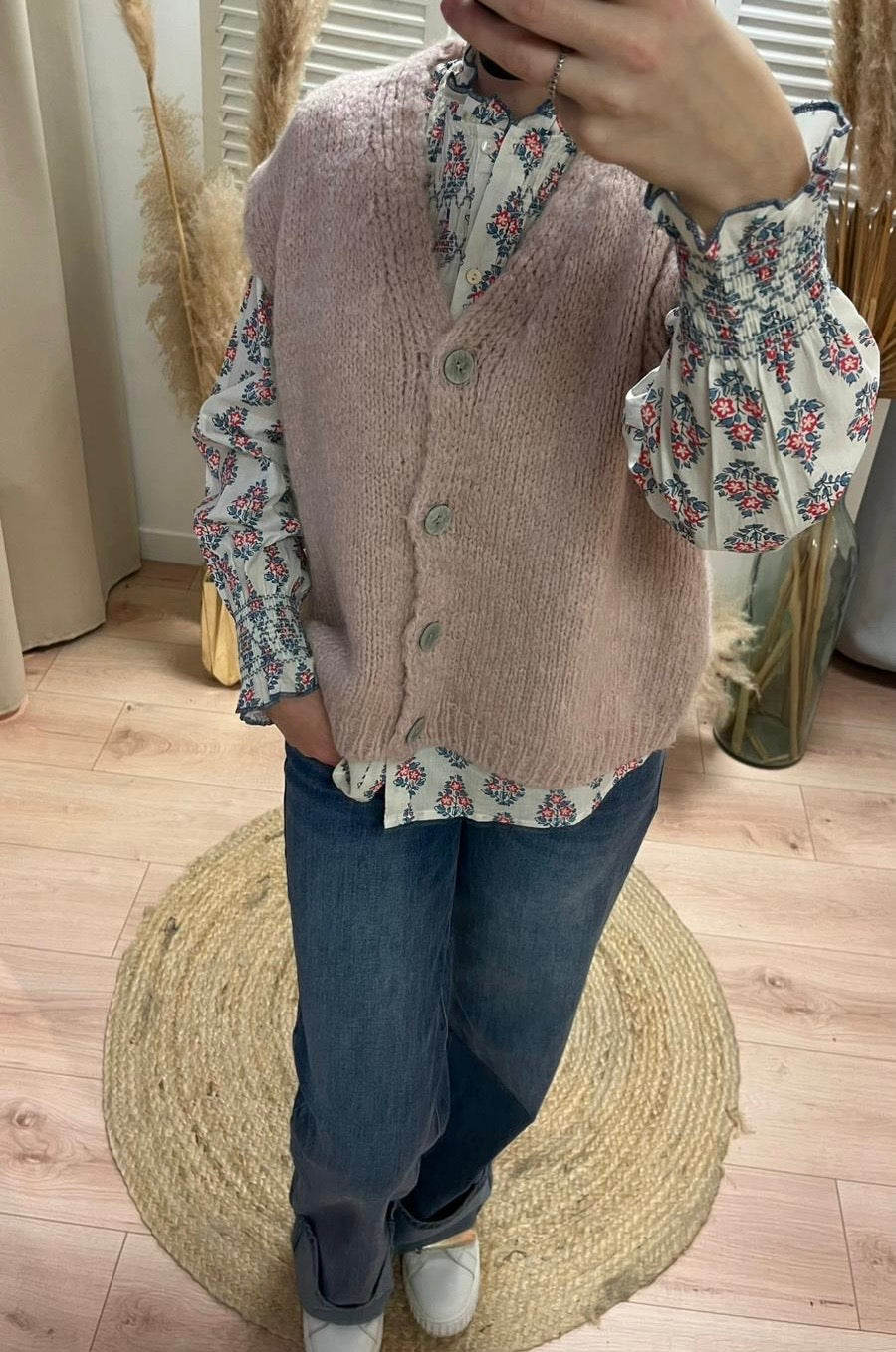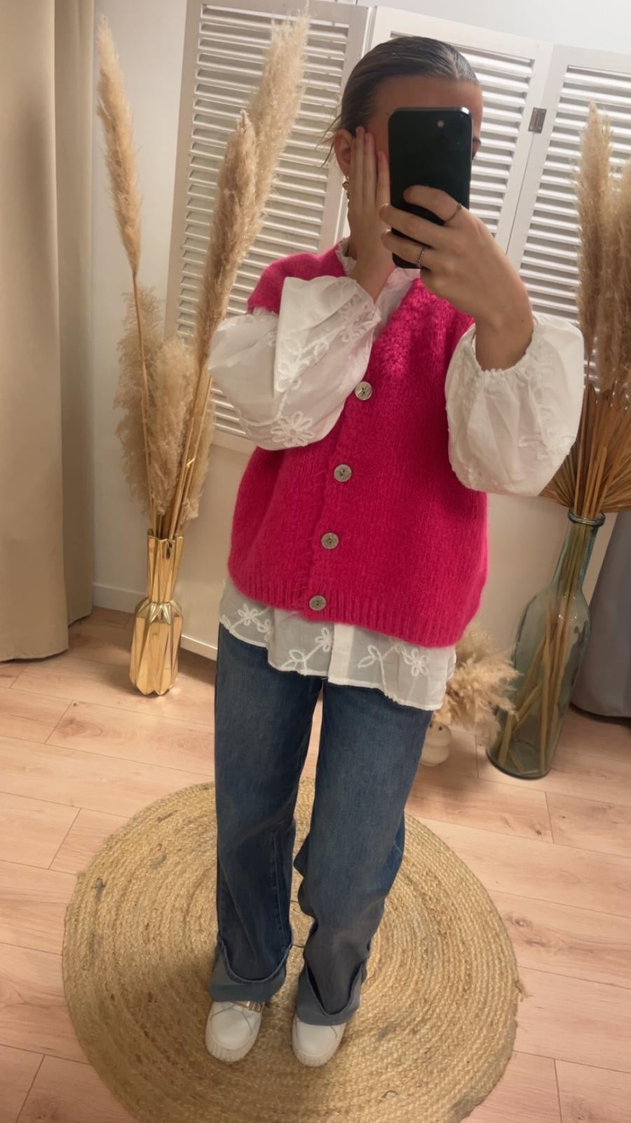 Gilet sans manches avec quartes gros boutons nacrés pour un peu de chaleur avec élégance.