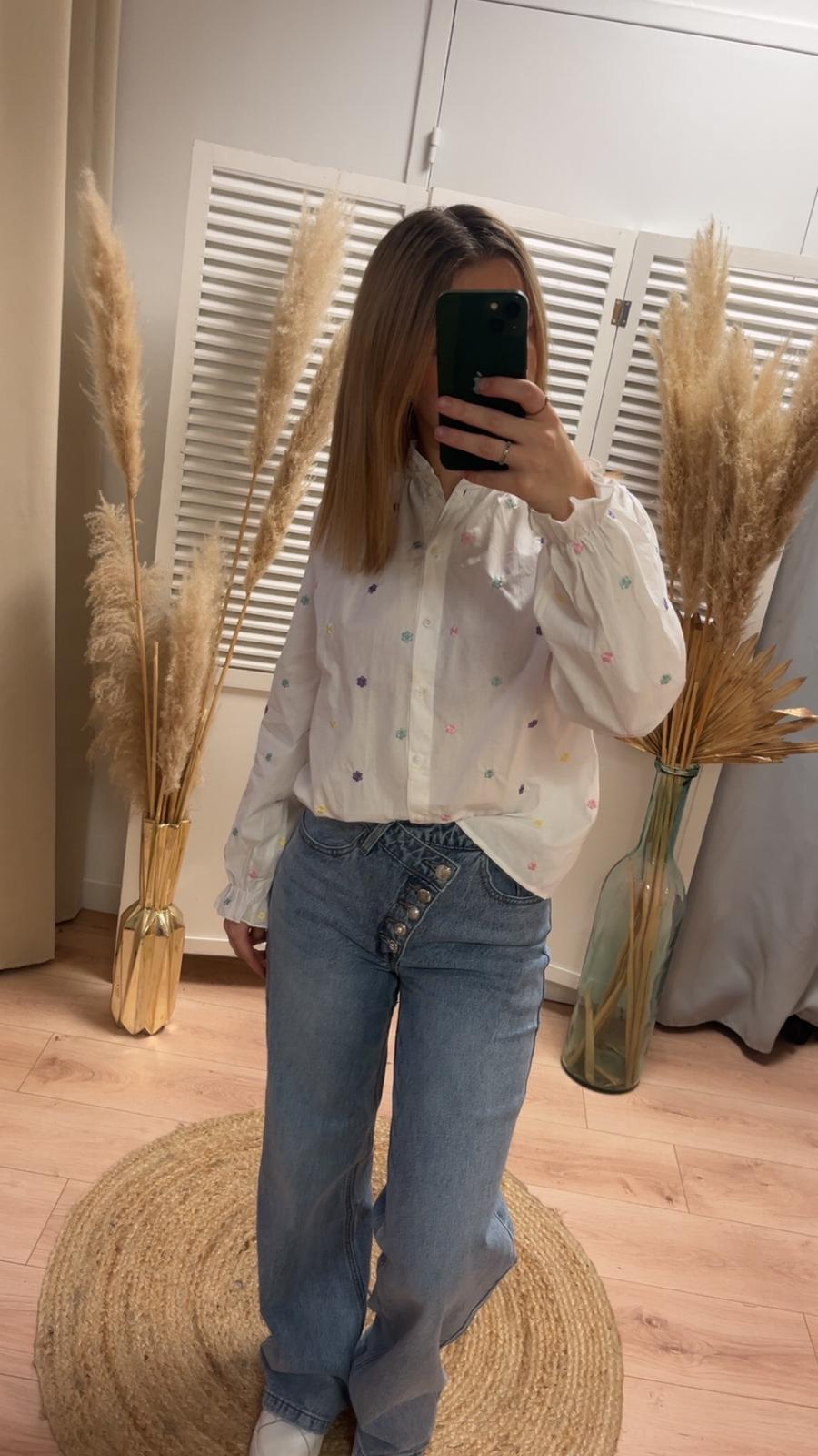Jean très tendance avec sa fermeture asymétrique par des boutons tous différents.