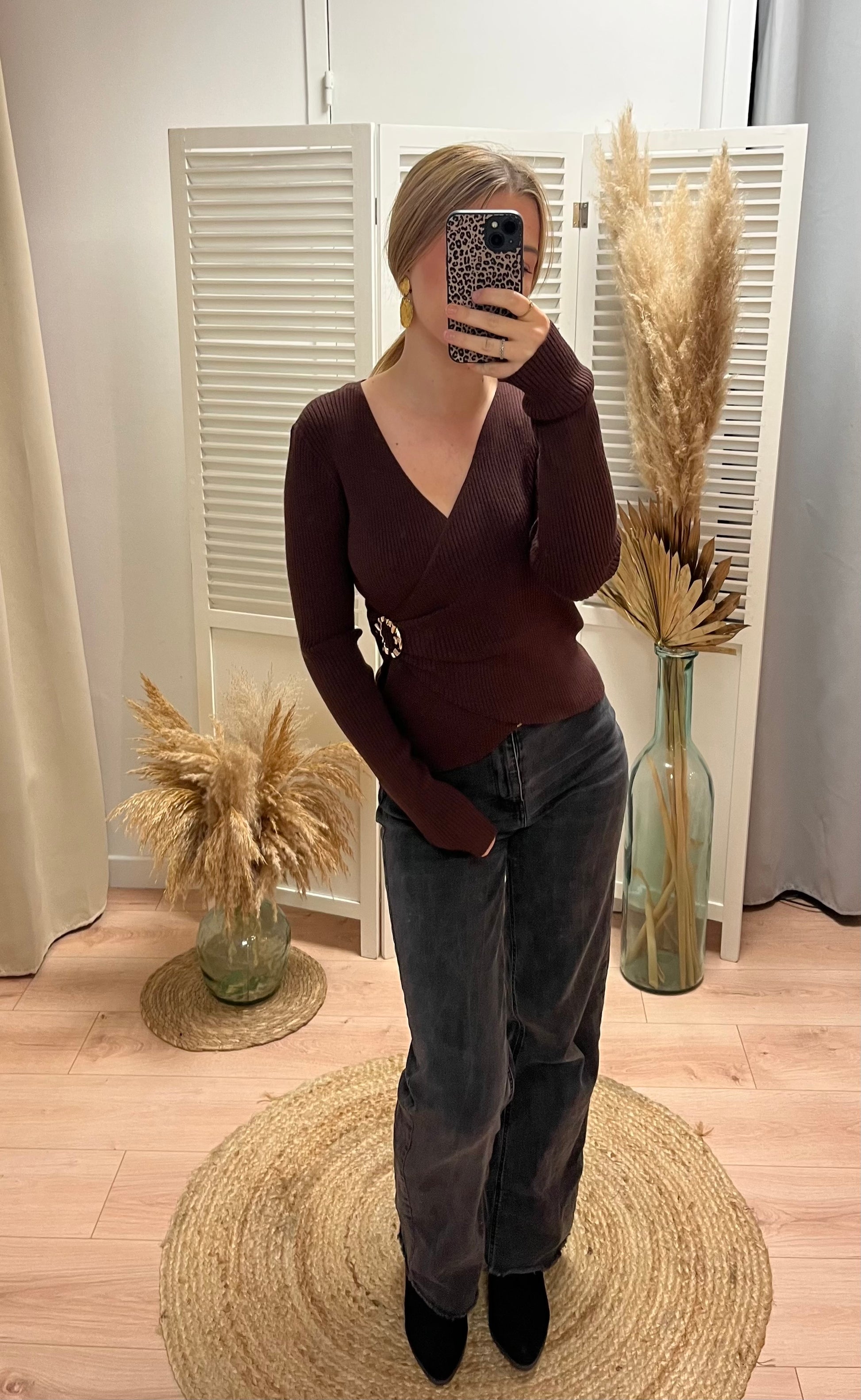 Pull marron forme originale orné sur le coté d'une jolie attache dorée.