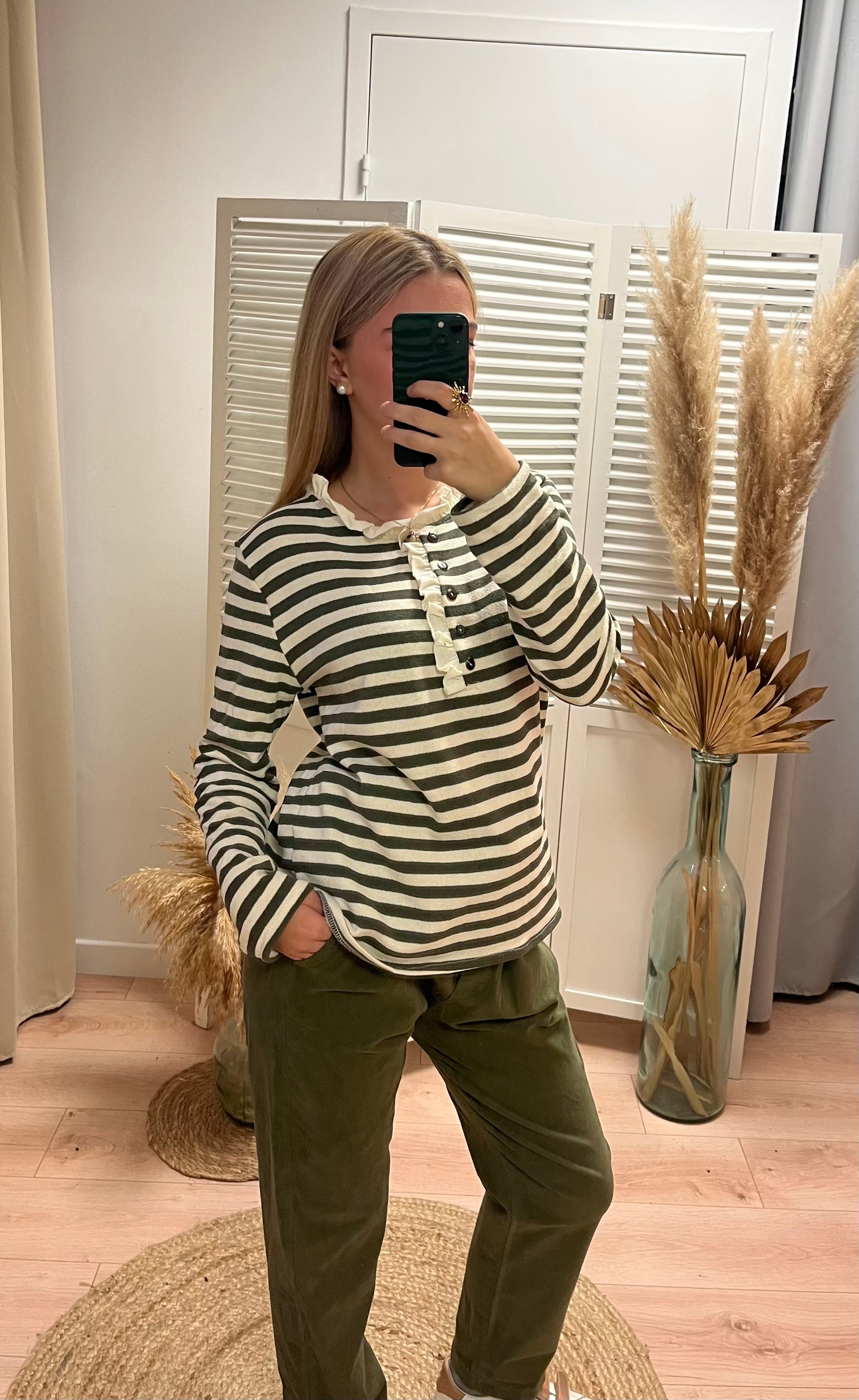 T-shirt rayé kaki , chocolat , col froufrou , manches longues , finition du col avec deux boutons .